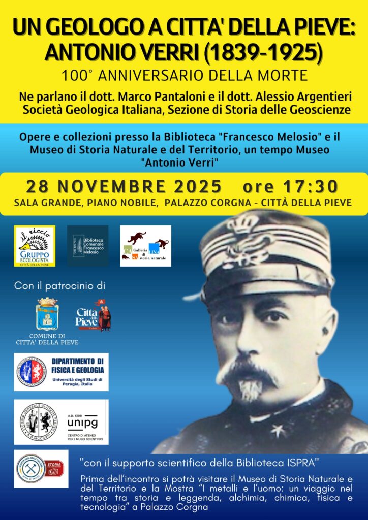Il Gruppo Ecologista “Il Riccio” gestore del Museo di Storia Naturale e del Territorio di Città della Pieve, di proprietà dell’Amministrazione Comunale, e il CAMS – Centro di Ateneo per i Musei Scientifici dell’Università degli Studi di Perugia, unitamente alla Biblioteca Comunale “Francesco Melosio” e con il Patrocinio del Comune di Città della Pieve, del Dipartimento di Fisica e Geologia dell’Università degli Studi di Perugia e della Sezione di Storia delle Geoscienze della Società Geologica Italiana, sono lieti di invitare all’incontro “Un Geologo a Città della Pieve: Antonio Verri (1839-1925) 2025 – 100° anniversario della morte” che si terrà a Città della Pieve venerdì 28 novembre alle ore 17.30, presso la Sala Grande di Palazzo della Corgna, per riscoprire insieme la figura di un illustre geologo pievese: Antonio Verri. L’evento, presenziato dal Sindaco della città, Fausto Risini, vedrà alternarsi due studiosi di geoscienze, il Dott. Marco Pantaloni e il Dott. Alessio Argentieri dell’ISPRA – Istituto Superiore per la Protezione e la Ricerca Ambientale, che si sono ampiamente occupati della figura e del lavoro di Antonio Verri e che hanno curato un volume della SGI-Società Geologica Italiana dedicato ai Presidenti, tra cui il geologo pievese.