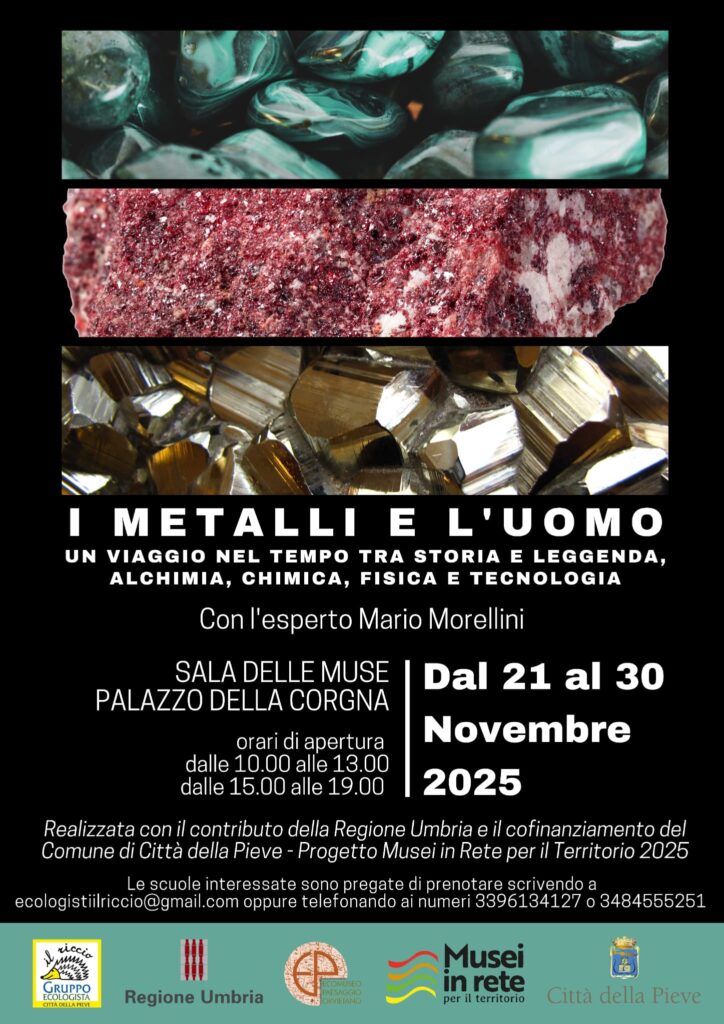 Il Gruppo Ecologista “Il Riccio” comunica la prossima apertura della Mostra “I metalli e l’uomo: un viaggio nel tempo tra storia e leggenda, alchimia, chimica, fisica e tecnologia”, realizzata con il contributo della Regione Umbria e il cofinanziamento del Comune di Città della Pieve – Progetto Musei in Rete per il Territorio 2025.